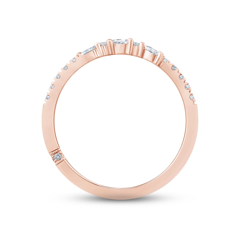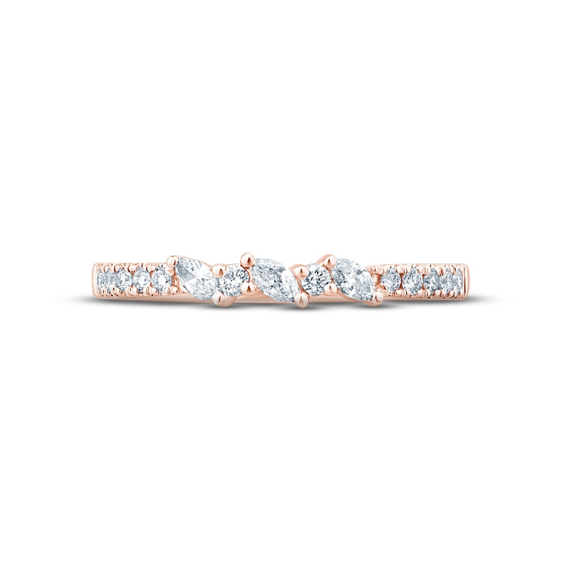 A beautiful tribute to your unending romance, this anniversary band displays round-cut diamonds twinkling between marquise-cut diamonds at the center. More round diamonds shimmer down both sides of the 18K rose gold band for a total diamond weight of 1/4 carat. The diamonds are independently certified. From the Monique Lhuillier Bliss collection, available exclusively at KAY. Please note: This ring is available in limited sizes. If you don't see your size here, please visit a store to order your ring.