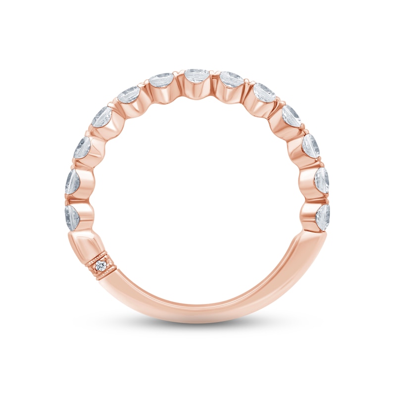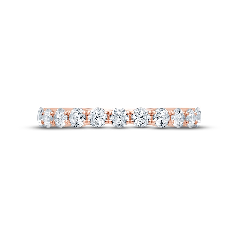 This romantic anniversary band displays a row of radiant independently certified round diamonds. Fashioned in dreamy 18K rose gold, the ring has a total diamond weight of 1 carat. From the Monique Lhuillier Bliss collection, available exclusively at KAY. Please note: This ring is available in limited sizes. If you don't see your size here, please visit a store to order your ring.