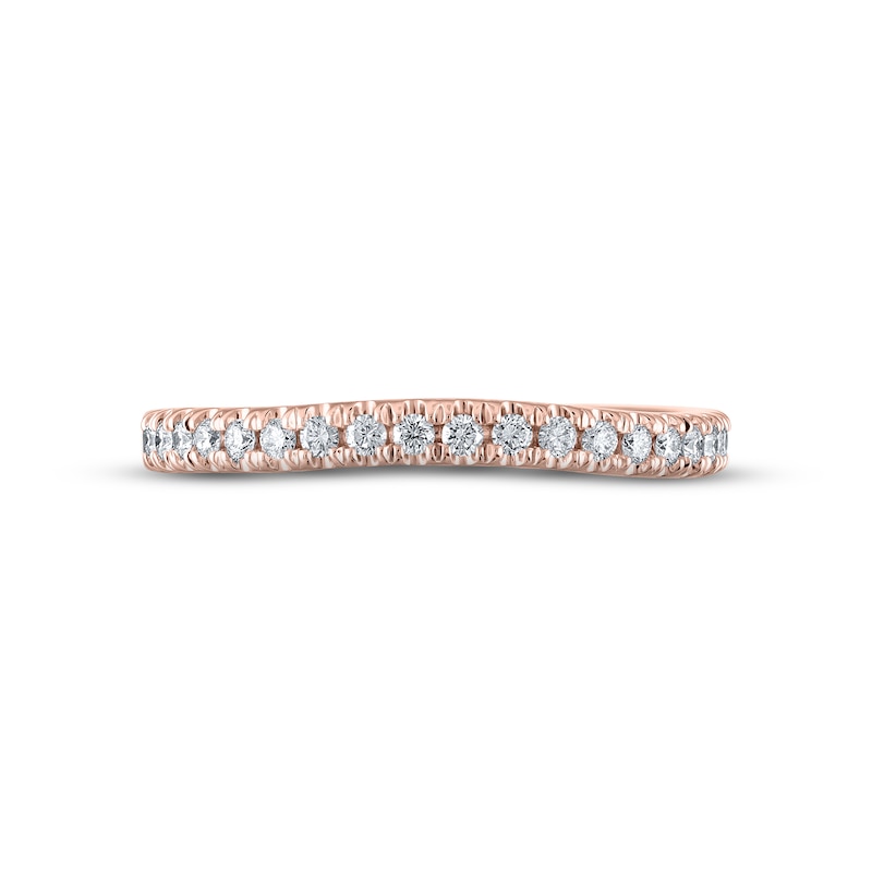 This beautiful and classic wedding band from THE LEO Diamond® bridal collection features a slight contour to fit alongside the matching engagement ring (sold separately). Sparkling round diamonds line the 14K rose gold band to give the ring a total diamond weight of 1/4 carat.
