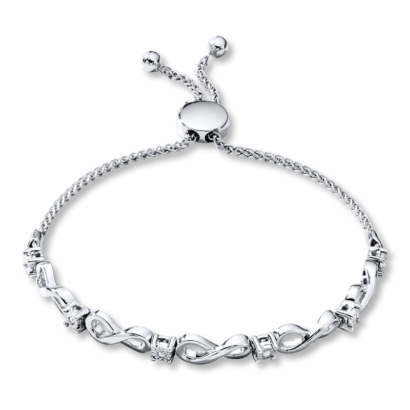 Diamond accents and infinity symbols adorn this trendy sterling silver bracelet for her. The round wheat chain is adjustable with a bolo clasp up to 9.5 inches in length.