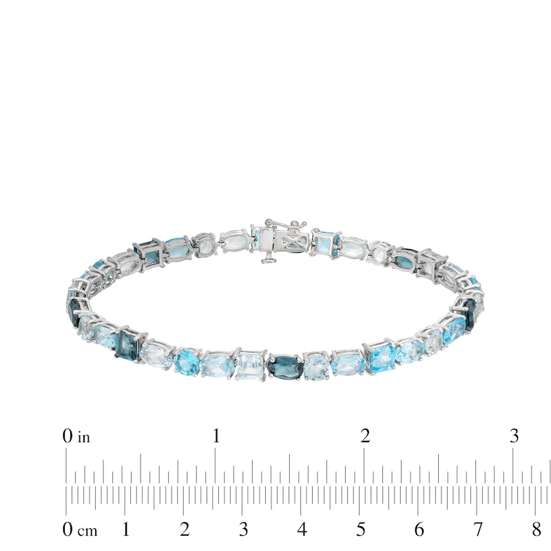 New arm candy? Yes, please! With a colorful twist on the classic tennis bracelet, you'll fall in love with its complementary sea and sky blue hues. A winning combination of cuts and shapes in both Swiss and London Blue topaz are interspersed with oval, round and square-shaped aquamarines. Fashioned in stylish sterling silver, the bracelet is from our Vibrant Shades™ collection, measures 7.5 inches, and secures with a box clasp.