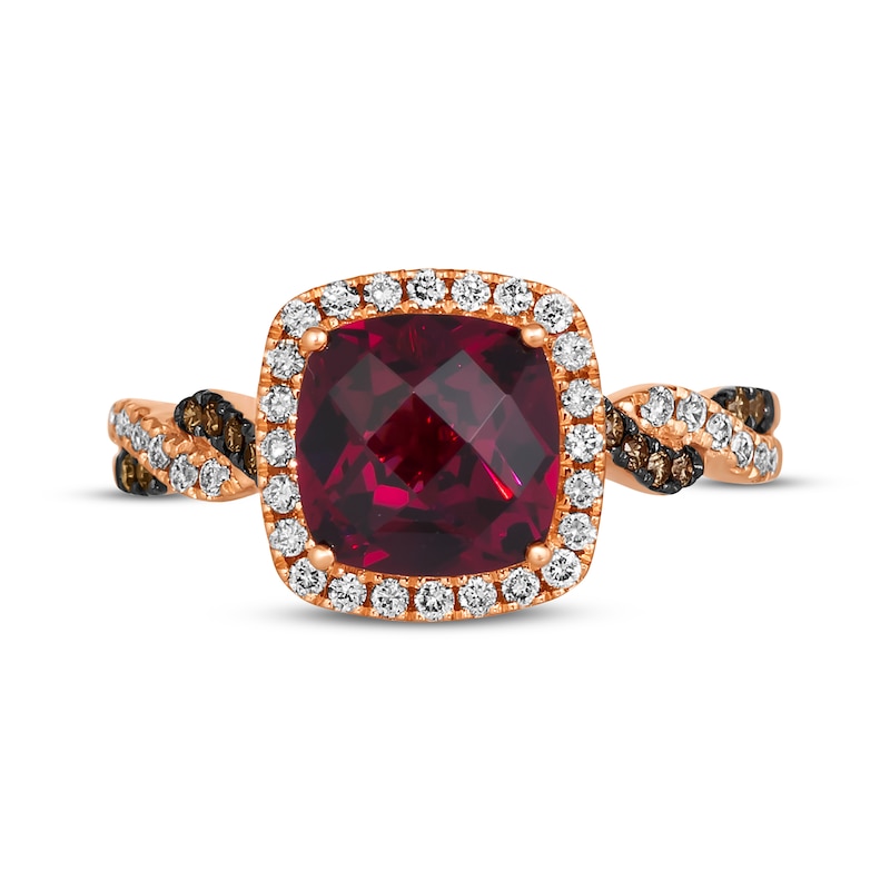This irresistible Le Vian® necklace from the KAY exclusive Chocolate Twist™ collection displays a succulent cushion-cut Raspberry Rhodolite® garnet at the center. Round Nude Diamonds™ trace the edges of the pendant and sparkle up the bail, twisting with a ribbon of round rich Chocolate Diamonds®. The necklace is crafted in sweet 14K Strawberry Gold® and has a total diamond weight of 1/5 carat. The pendant is centered on a 19-inch rolo chain that secures with a lobster clasp. Le Vian®. Discover the Legend.