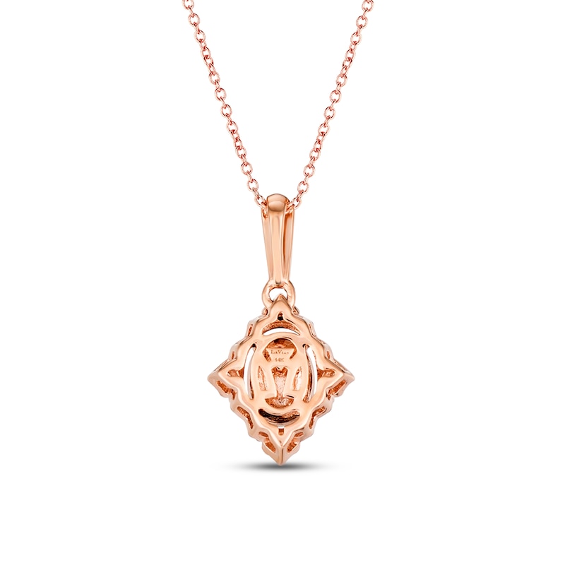This magnificent necklace from Le Vian® showcases a highly selective oval-cut Peach Morganite™. The splendid gemstone is perfectly perched amidst a frame of Chocolate Diamonds® and Nude Diamonds™. The masterful combination of peachy pink flavors is fashioned in 14K Strawberry Gold®. With a total diamond weight of 1/6 carat, the pendant suspends from an 18-inch cable chain and secures with a lobster clasp. Le Vian®. Discover the Legend.