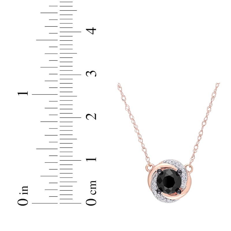 A dramatic display, this necklace makes a splendid statement. Crafted in 10K rose gold, the style features a round-cut 1-carat black diamond in black rhodium wrapped in a whirlwind of round-cut white diamond accents in white rhodium. The design suspends at the center of a 17-inch rope chain that secures with a spring ring clasp.