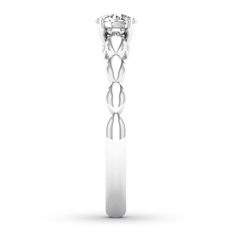 This wonderful engagement ring for her is a sight to behold from every angle. A sparkling center round diamond is complemented by romantic curves of 14K white gold billowing along each side of the band. Turn the ring to the profile view to discover a shimmering peak of diamonds, bringing the total diamond weight to 5/8 carat.