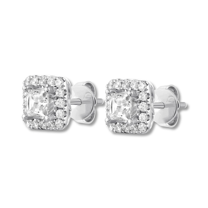 These THE LEO Diamond® earrings for her provide stunning sparkle with independently certified princess-cut diamonds framed in round diamonds. Styled in polished 14K white gold, the earrings have a total diamond weight of 1 carat and secure with friction backs. Each princess-cut diamond is laser-inscribed with a unique Gemscribe® serial number.