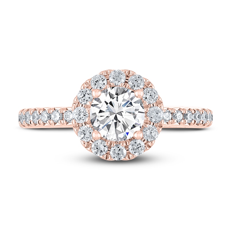 A stunning 3/4-carat round diamond sparkles at the center of this chic engagement ring from THE LEO Diamond® collection. Set in dreamy 14K rose gold, brilliant round diamonds halo the center and shimmer down the band. The ring has a total diamond weight of 1 1/8 carats. The independently certified center diamond is laser-inscribed with a unique Gemscribe® serial number to ensure your peace of mind.