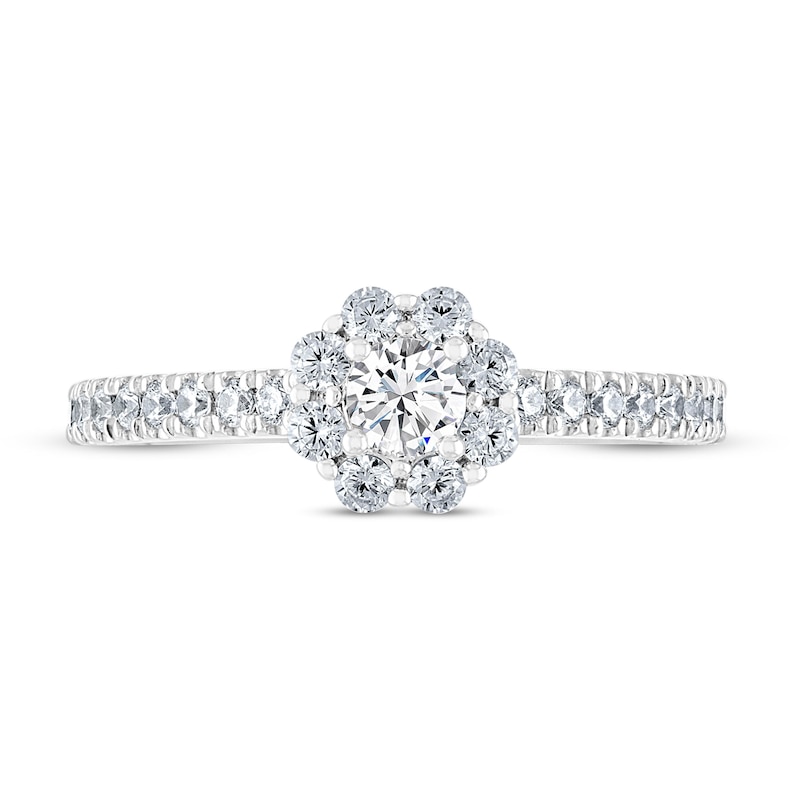 Shimmering round diamonds halo a brilliant round diamond at the center of this fabulous THE LEO Diamond® engagement ring. Additional diamonds line the 14K white gold band to bring the ring’s total diamond weight to 1/2 carat. The central diamond is independently certified and laser-inscribed with a unique Gemscribe® serial number