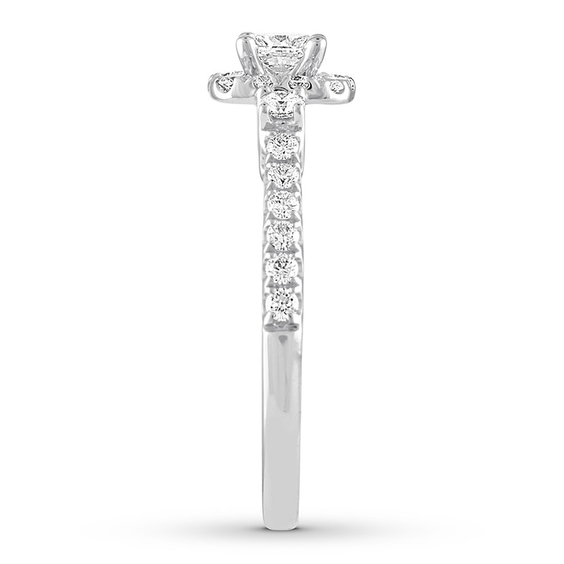 When love is as powerful as yours, it sparkles. When looking for a diamond that sparkles as brightly as your love, look no further than THE LEO Diamond®. This THE LEO Diamond® engagement ring displays an independently certified, princess-cut diamond at the center. Breathtaking round diamonds frame the center and decorate the band. The ring is crafted of 14K white gold and has a total diamond weight of 3/4 carat. The center diamond is laser-inscribed with a unique Gemscribe® serial number for your peace of mind.