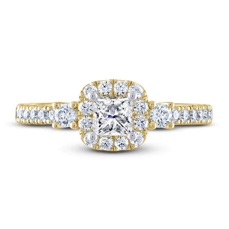 A gorgeous 1/3-carat princess-cut diamond shines in 14K white gold prongs at the center of this beautiful engagement ring from THE LEO Diamond® collection. Brilliant round diamonds halo the center, and more round diamonds shimmer down the 14K yellow gold band. The ring has a total diamond weight of 3/4 carat. The independently certified center diamond is laser-inscribed with a unique Gemscribe® serial number to ensure your peace of mind.
