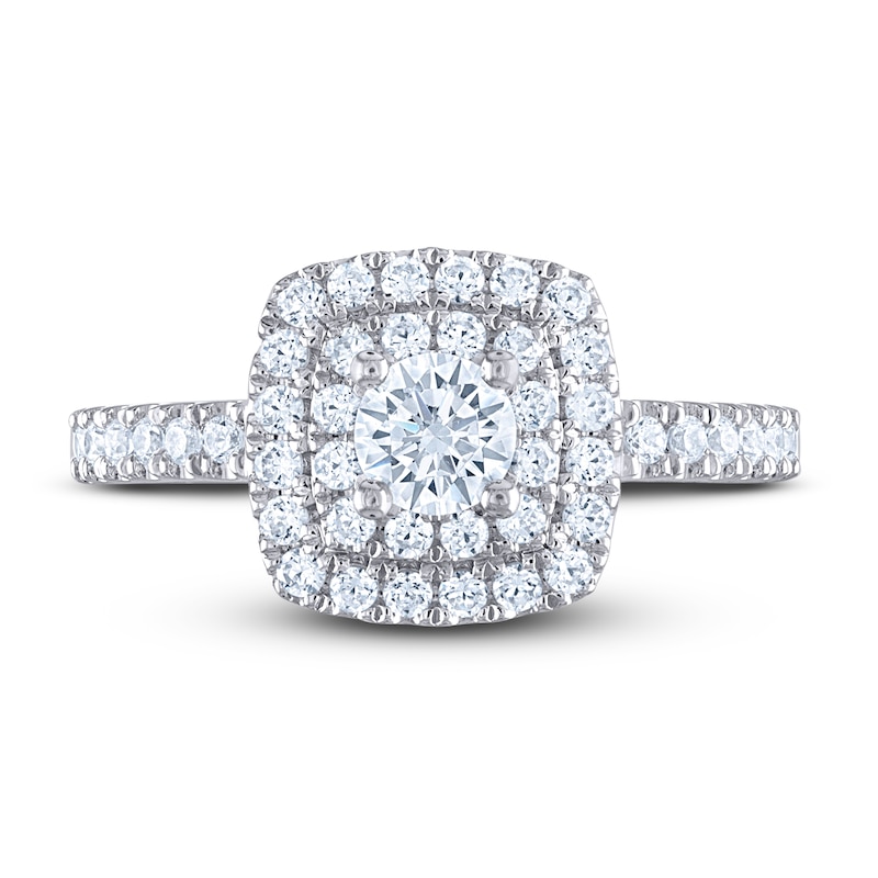 This stunning diamond engagement ring from THE LEO Diamond® collection showcases a 1/3-carat round-cut diamond at its center, framed by a double halo of brilliant round diamonds. More round diamonds shimmer down the sides of the 14K white gold band for a total diamond weight of 3/4 carat. The central diamond is independently certified and laser-inscribed with a unique Gemscribe® serial number.