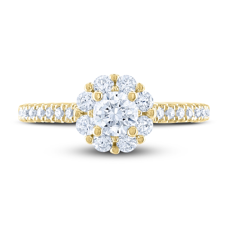 This radiant engagement ring from THE LEO Diamond® collection showcases a 1/2-carat brilliant round diamond at its center, surrounded by a beautiful halo of round diamonds. More round diamonds sparkle down the sides of the 14K yellow gold band for a total diamond weight of 7/8 carat. The central diamond is independently certified and laser-inscribed with a unique Gemscribe® serial number.