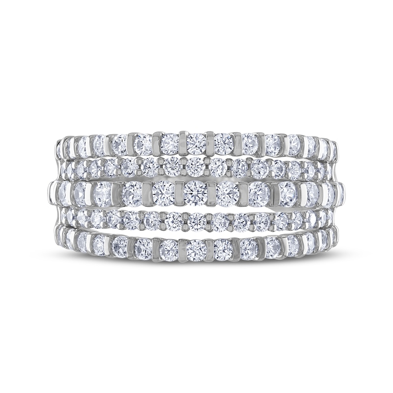 This radiant ring from THE LEO Diamond® collection features rows of independently certified diamonds set at varied heights for maximum sparkle. Larger round diamonds are channel set in rows alternating with smaller round diamonds in prong settings. This exquisite ring is crafted in 14K white gold and features a total diamond weight of 1 1/4 carats.