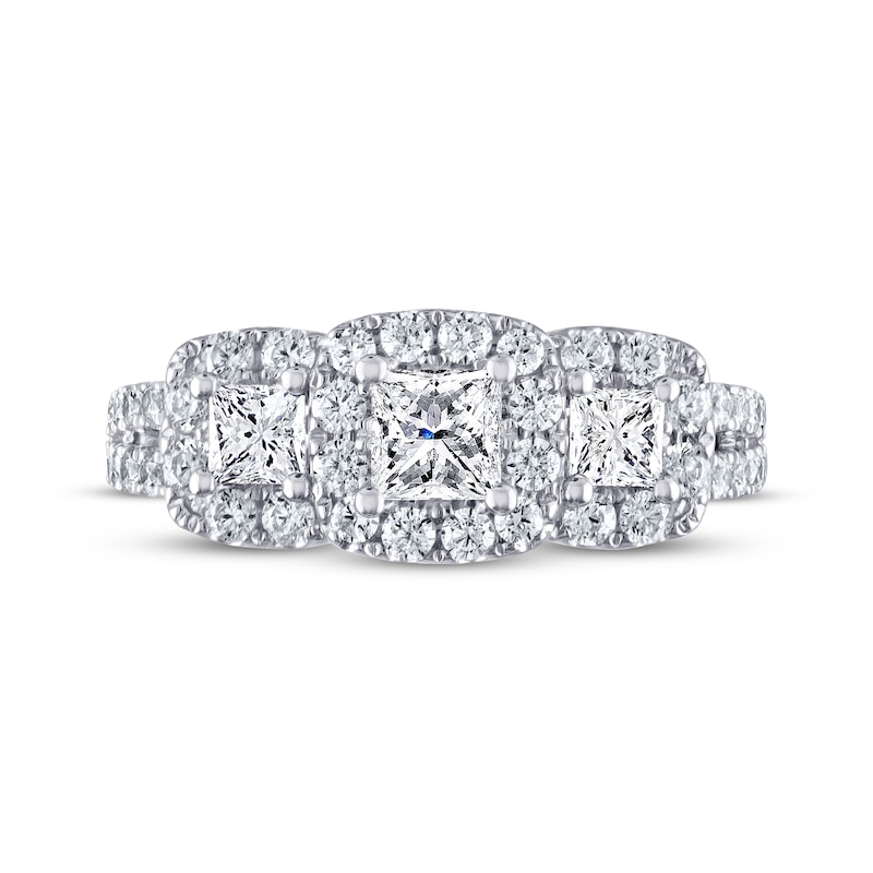 Three stunning princess-cut diamonds sparkle at the center of this exquisite THE LEO Diamond® engagement ring. Each center diamond features a halo of brilliant round-cut diamonds, and more round-cut diamonds dazzle down each side of the 14K white gold band, giving the ring a total diamond weight of 1 1/3 carats. The independently certified center diamond is laser-inscribed with a unique Gemscribe® serial number to ensure your peace of mind.