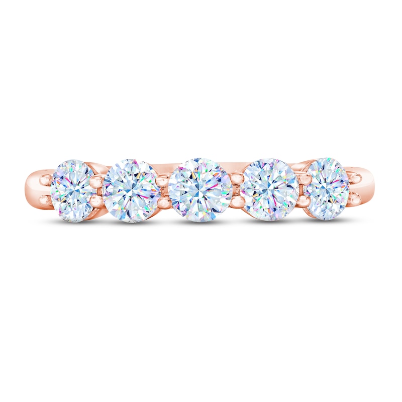 This romantic anniversary ring for her showcases five dazzling First Light® diamonds. From Leo Schachter, the independently-certified diamonds feature Fire Prism™ technology that creates infinite flashes of color for more fire and sparkle. Styled in lovely 14K rose gold, the ring has a total diamond weight of 1 carat.