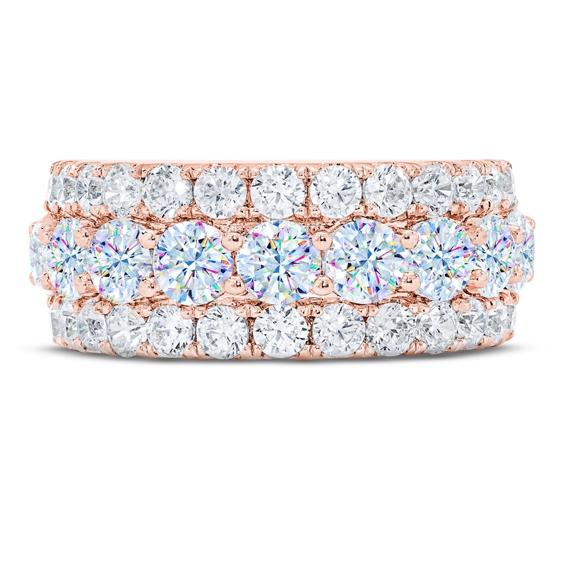 This splendid anniversary ring for her displays a distinctive center row of First Light® diamonds. From Leo Schachter, the independently-certified diamonds feature Fire Prism™ technology that creates infinite flashes of color for more fire and sparkle. Styled in romantic 14K rose gold, two outer rows of radiant round diamonds bring the total diamond weight to an impressive 3 carats.