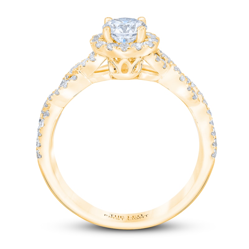 A stunning round-cut 1/2-carat First Light® diamond sparkles at the center of this radiant engagement ring for her. From Leo Schachter, the center diamond features Fire Prism™ technology, creating infinite flashes of color for more fire and sparkle. Brilliant round-cut diamonds halo the center and weave down the 14K yellow gold band for a total diamond weight of 7/8 carat. The diamonds are independently certified, and the center diamond is laser-inscribed with a unique Gemscribe® serial number to ensure your peace of mind. Live Your Love in Color.™