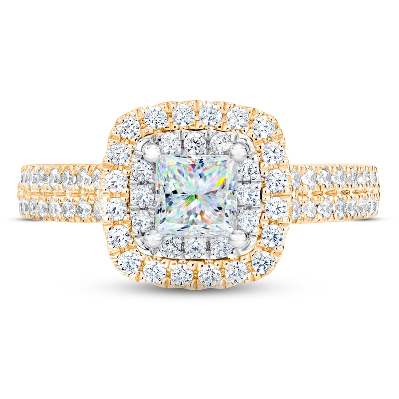 A brilliant 1/2-carat princess-cut First Light® diamond is the center of attention in this stunning engagement ring for her, surrounded by two halos of round-cut diamonds that adorn the band. From Leo Schachter, the independently-certified diamond features Fire Prism™ technology that creates infinite flashes of color for more fire and sparkle. The ring has a total diamond weight of 1 carat and is crafted in modern 14K yellow and 14K white gold for an unforgettable design. The center diamond is laser-inscribed with a unique Gemscribe® serial number to ensure your peace of mind. Live Your Love in Color.™