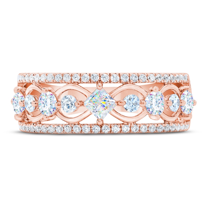 A stunning princess-cut First Light® diamond glitters amid an array of round-cut First Light® diamonds in this ravishing anniversary ring for her. From Leo Schachter, the independently-certified diamonds feature Fire Prism™ technology that creates infinite flashes of color for more fire and sparkle. Styled in 14K rose gold, round diamond accents add additional shimmer to the elegant openwork band and bring the total diamond weight to 1 carat.