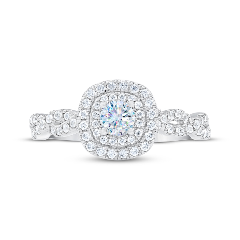 Express your love with the colorful flash of THE LEO First Light® Diamond engagement ring. Crafted in 14K white gold, the design showcases a 1/4-carat round-cut diamond that features microscopic nano-prisms, creating infinite flashes of color for more fire and sparkle. The independently certified center diamond is wrapped in a double cushion-shaped halo of round diamonds. More round diamonds adorn the twisted shank for added shimmer and a total diamond weight of 5/8 carat. The center diamond is laser-inscribed with a unique Gemscribe® serial number to ensure your peace of mind.