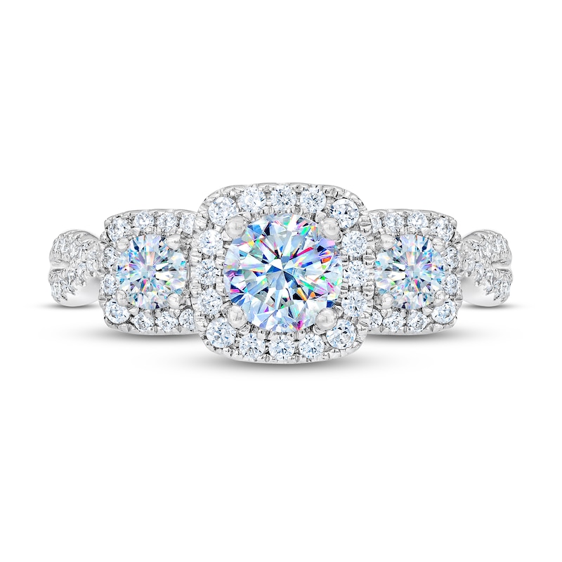 This stunning three-stone diamond engagement ring features brilliant round-cut First Light® diamonds at its center, each haloed by round diamonds. From Leo Schachter, the center diamond features Fire Prism™ technology, creating infinite flashes of color for more fire and sparkle. Sparkling round-cut diamonds shine down the 14K white gold twisted band for a total diamond weight of 1 carat. The diamonds are independently certified, and the center diamond is laser-inscribed with a unique Gemscribe® serial number to ensure your peace of mind. Live Your Love in Color.™