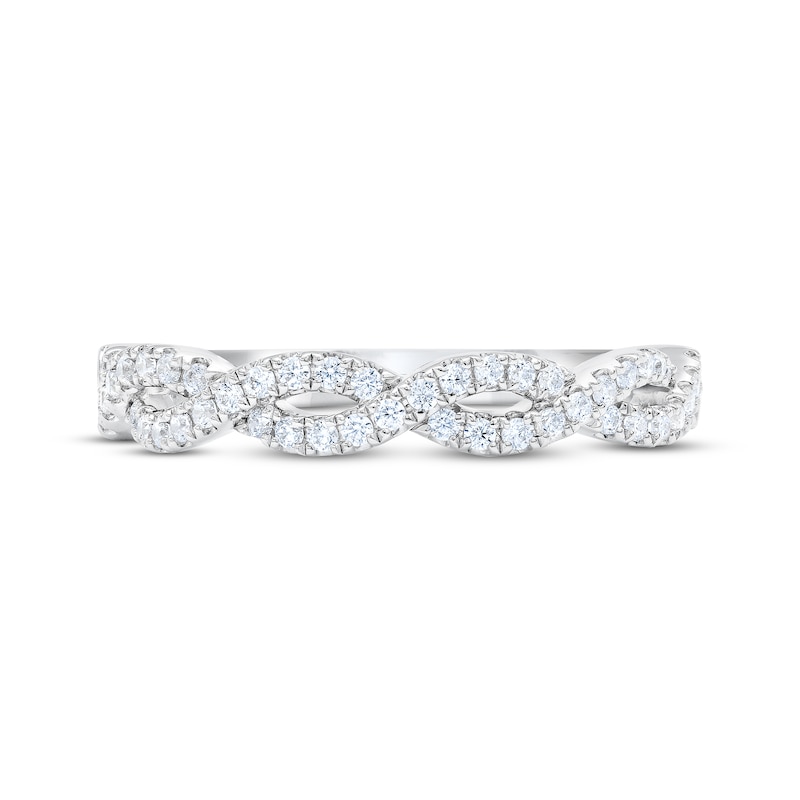 This glamorous wedding band twists with shimmering round-cut diamonds. With a total diamond weight of 1/3 carat, the band is fashioned in 14K white gold and crafted to perfectly pair with her THE LEO First Light® Diamond engagement ring (sold separately).