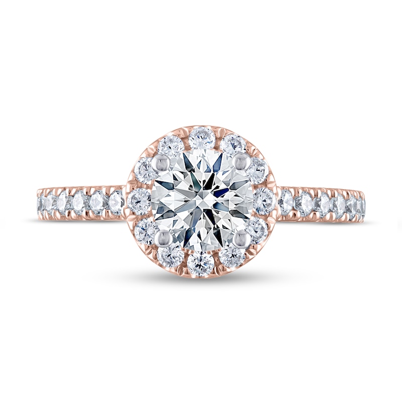 Introducing THE LEO® Ideal Cut Diamond, a rare diamond of geometrically perfect proportions that releases the maximum amount of fire, sparkle and brilliance – to let your unique love for each other truly shine through. This beautiful diamond engagement ring for her features a 1-carat independently-certified, round-cut diamond at its center, surrounded by a striking halo of round diamonds. More brilliant round-cut diamonds sparkle down each side of the chic 14K rose gold band, giving the ring a total diamond weight of 1 1/3 carats. The independently certified center diamond is laser-inscribed with a unique Gemscribe® serial number to ensure your peace of mind.