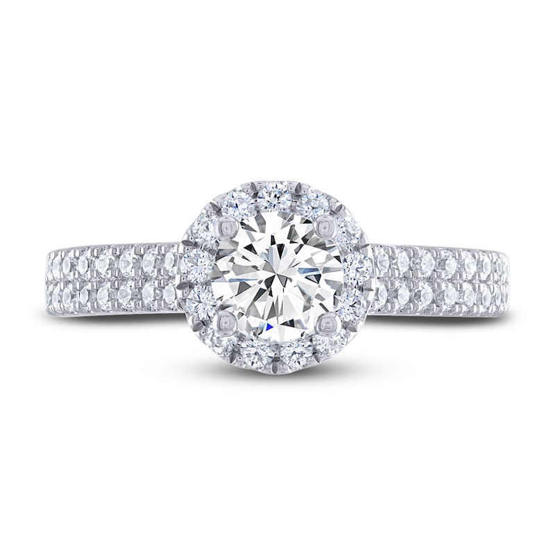 Introducing THE LEO® Legacy Lab-Created Diamond, which features additional facets that are strategically placed onto the lab-created diamond, maximizing the return of light and creating far away sparkle. A stunning 3/4-carat round lab-created diamond glitters within a halo of radiant round lab-created diamonds in this entrancing engagement ring for her. Twin rows of additional round lab-created diamonds adorn the 14K white gold band for a total lab-created diamond weight of 1 1/6 carats. The central lab-created diamond is independently certified and laser-inscribed with a unique Gemscribe® serial number.