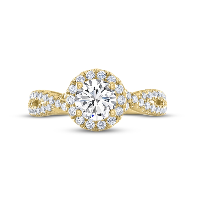Introducing THE LEO® Legacy Lab-Created Diamond, which features additional facets that are strategically placed onto the lab-created diamond, maximizing the return of light and creating far away sparkle. A 1-carat round lab-created diamond glitters within a halo of sparkling round-lab created diamonds in this magnificent engagement ring for her. More round lab-created diamonds dazzle along the twisted 14K yellow gold band for a total lab-created diamond weight of 1 3/8 carats. The central lab-created diamond is independently certified and laser-inscribed with a unique Gemscribe® serial number.