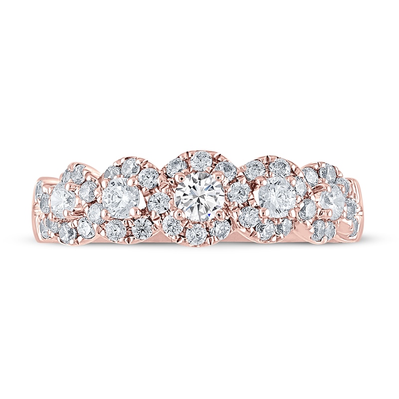 Celebrate your continued love with this magnificent anniversary ring from THE LEO Diamond® collection. The 14K rose gold ring features beautiful round diamonds, surrounded by smaller round diamonds for extra sparkle. The ring has a total diamond weight of 3/4 carat and the diamonds are independently certified.