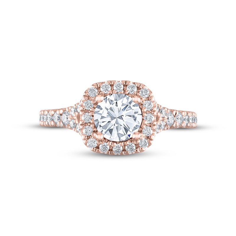 A stunning 1 carat round-cut center diamond shines brightly in this beautiful engagement ring from THE LEO Diamond® collection. Round diamonds halo the independently-certified center stone and line down each side of the 14K rose gold band to give the ring a total diamond weight of 1 1/3 carats. The center diamond is laser-inscribed with a unique Gemscribe® serial number for your peace of mind.