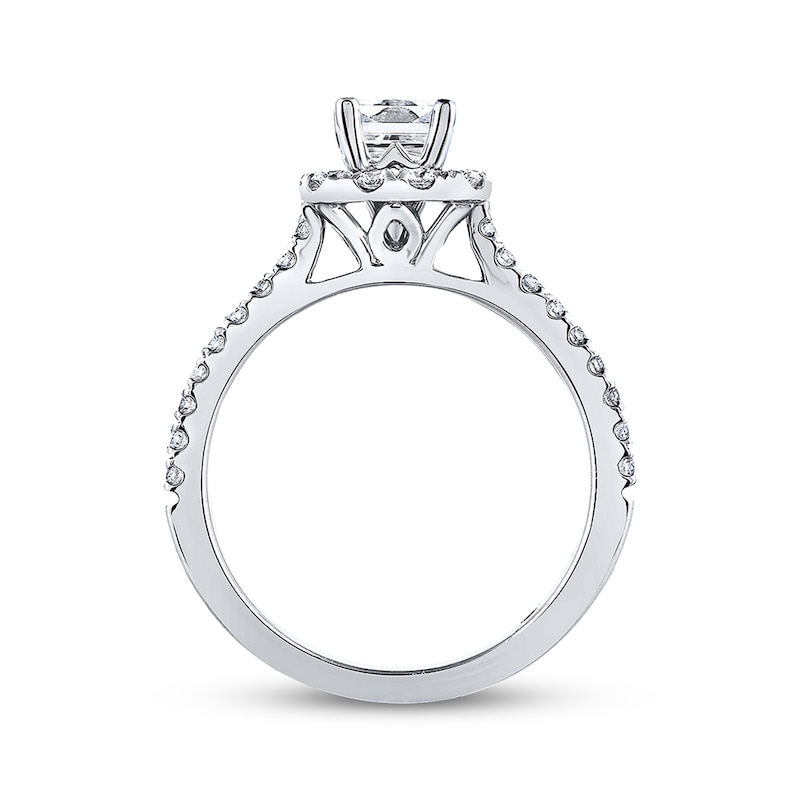 This elegant women's engagement ring displays a brilliant 1/2-carat, princess-cut THE LEO Diamond® center with a halo of sparkling round diamonds. Twin rows of additional round diamonds line the band of 14K white gold to complete the look, bringing the total diamond weight to 1 carat. Independently certified with three very high ratings on the GemEx scale, the center diamond is laser-inscribed with a unique Gemscribe® serial number to ensure your peace of mind.