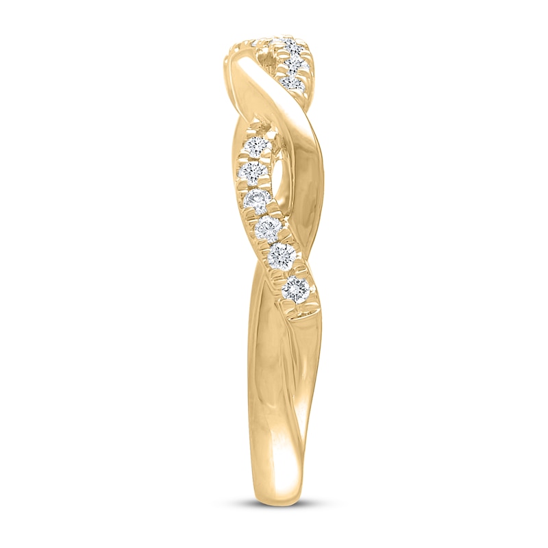 This gorgeous wedding band for her from THE LEO Diamond® collection features a beautiful twisted design, embellished with alternating 14K yellow gold and round diamonds. The ring has a total diamond weight of 1/5 carat and perfectly complements her matching Leo Diamond® engagement ring (sold separately).