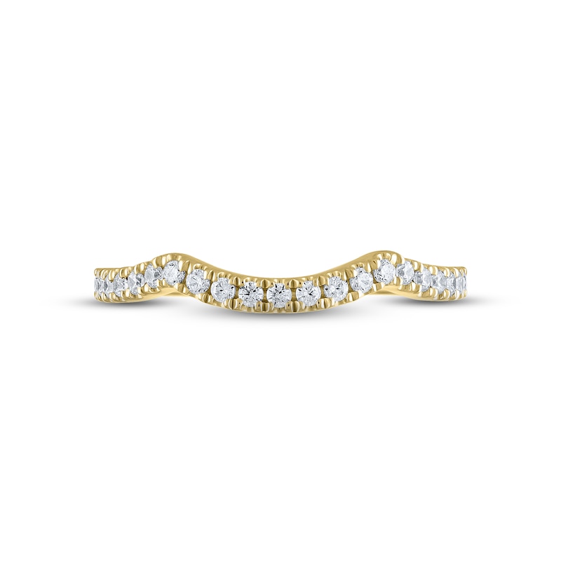 Independently-certified round-cut diamonds sparkle along this stunning THE LEO Diamond® wedding band, contoured to fit alongside her matching engagement ring (sold separately). The ring is crafted of 14K yellow gold and has a total diamond weight of 1/5 carat.