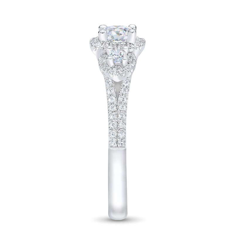 This breathtaking three-stone engagement ring for her showcases three brilliant round-cut First Light® diamonds, set in iconic 14K white gold. From Leo Schachter, the three diamonds feature Fire Prism™ technology that create infinite flashes of color for more fire and sparkle, and are each haloed by sparkling round-cut diamonds. More round-cut diamonds shimmer down each side of the band for a total diamond weight of 7/8 carat. The diamonds are independently certified, and the center diamond is laser-inscribed with a unique Gemscribe® serial number to ensure your peace of mind. Live Your Love in Color.™