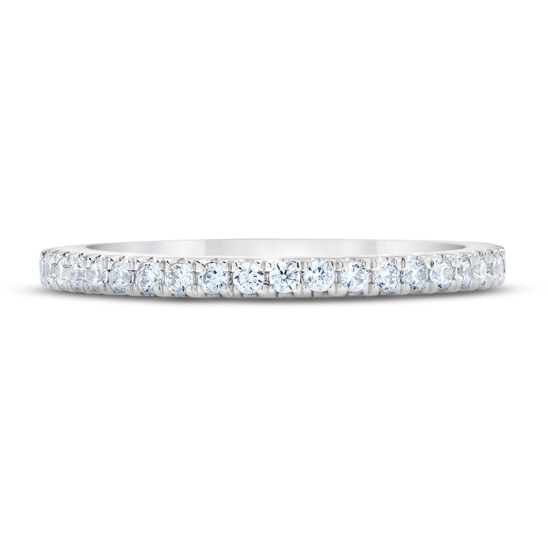 Brilliant round diamonds add a beautiful sparkle to this elegant wedding band for her. Styled in contemporary 14K white gold, the ring is designed to fit alongside her matching First Light® engagement ring (sold separately). The diamonds total 1/4 carat in weight.