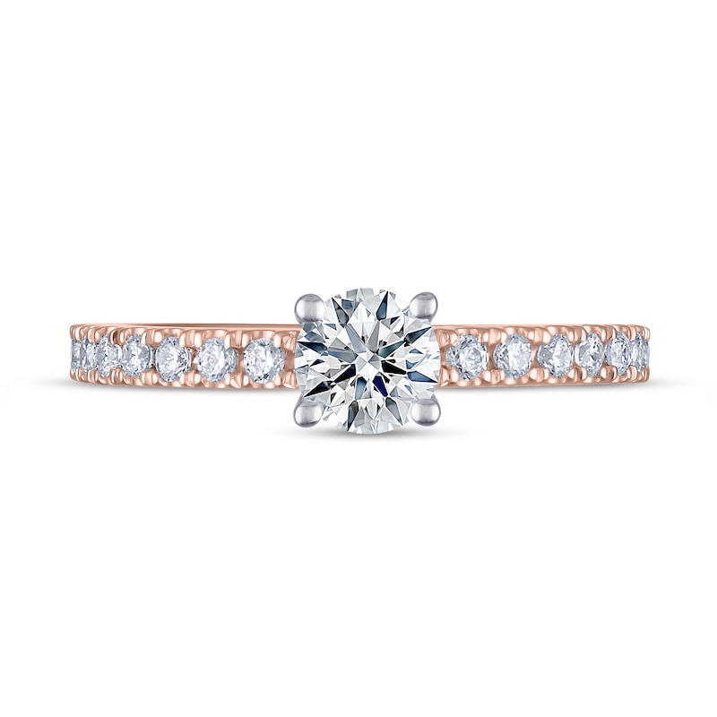 Introducing THE LEO® Ideal Cut Diamond, a rare diamond of geometrically perfect proportions that releases the maximum amount of fire, sparkle and brilliance – to let your unique love for each other truly shine through. This gorgeous engagement ring for her features a 1/2-carat, independently-certified, round-cut diamond at its center, flanked by brilliant round diamonds that shimmer down each side of the band. The ring is crafted in iconic 14K rose gold and has a total diamond weight of 3/4 carat. The independently certified center diamond is laser-inscribed with a unique Gemscribe® serial number to ensure your peace of mind.