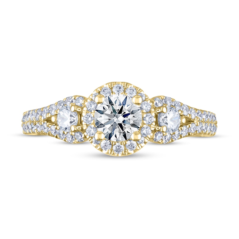 Introducing THE LEO® Ideal Cut Diamond, a rare diamond of geometrically perfect proportions that releases the maximum amount of fire, sparkle and brilliance – to let your unique love for each other truly shine through. This extraordinary 3-stone engagement ring for her features three brilliant round-cut diamonds at its center, the middle enhanced by a beautiful halo of round diamonds. More round diamonds shimmer down each side of the band for a total diamond weight of 1 carat. The ring is crafted in iconic 14K yellow gold. The independently certified center diamond is laser-inscribed with a unique Gemscribe® serial number to ensure your peace of mind.