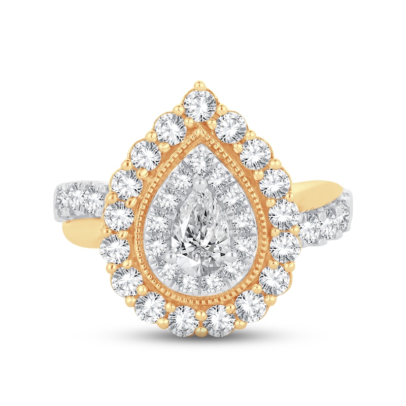 This resplendent engagement ring showcases a stunning pear-shaped diamond arrayed in a double-halo of radiant round diamonds. Additional round diamonds sparkle down the twisted band. Styled in classic 14K yellow gold, the ring has a total diamond weight of 1 1/2 carats. From the Now and Forever® bridal collection.