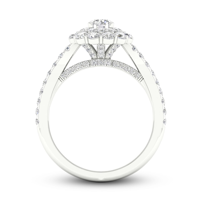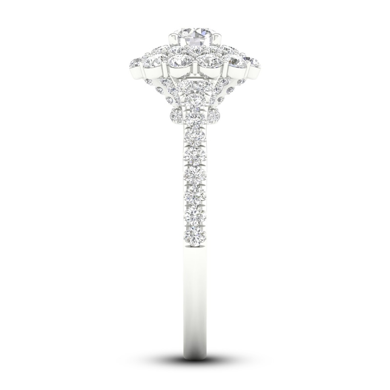 A stunning 1/3-carat round diamond sparkles at the center of this chic engagement ring. Set in iconic 14K white gold, an eye-catching double halo of round diamonds surrounds the center. More round diamonds glitter down the band and under the top for a total diamond weight of 1 1/4 carats. From the Now & Forever® bridal collection.