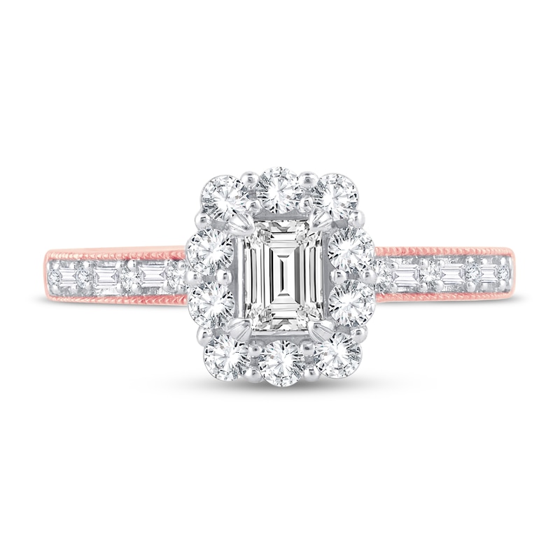 A stunning 1/4-carat emerald-cut diamond shines at the center of this classic engagement ring. Set in romantic 14K rose gold, brilliant round diamonds halo the center, and the sides of the band sparkle with alternating round and baguette-cut diamonds. Milgrain detailing finishes the design, and the ring has a total diamond weight of 3/4 carat. From the Now & Forever® bridal collection.