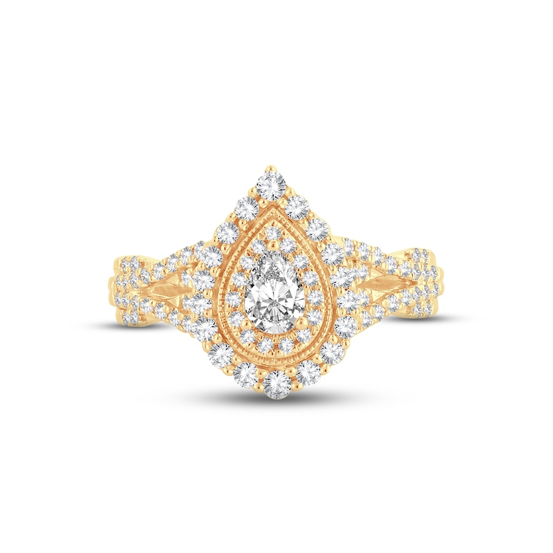An entrancing 1/4-carat pear-shaped diamond is framed by two rows of round-cut diamonds at the center of this sparkling engagement ring for her. More round diamonds cascade halfway down the interweaving, split-shank band, which is crafted in 14K yellow gold. The ring has a total diamond weight of 3/4 carat. From the Now and Forever® bridal collection.