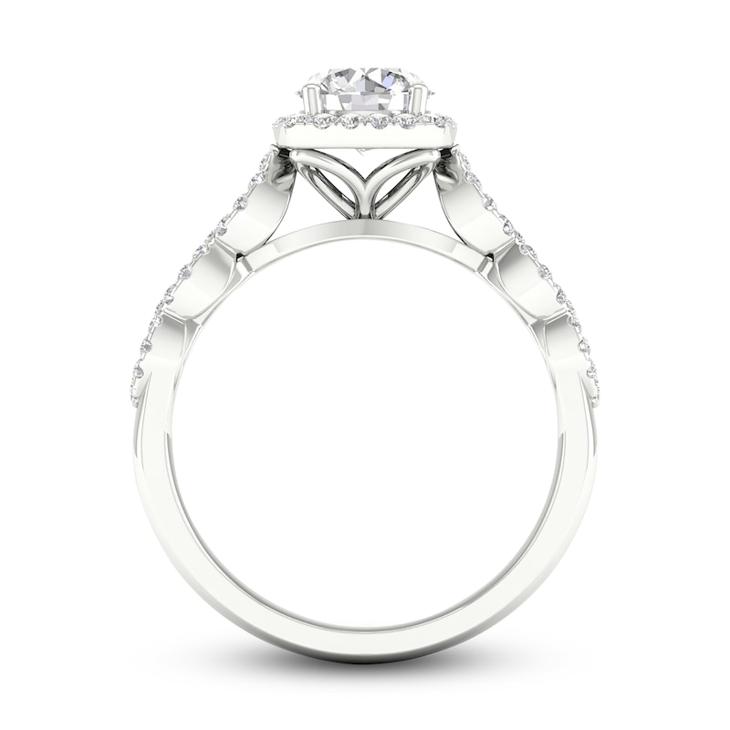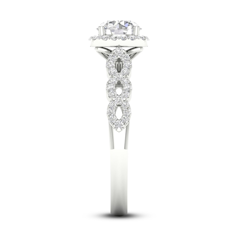 A stunning 3/4-carat round diamond sparkles at the center of this chic engagement ring for her. Set in iconic 14K white gold, round diamonds halo the center and shimmer down the sides of the band. The ring has a total diamond weight of 7/8 carat. From the Adore® bridal collection.