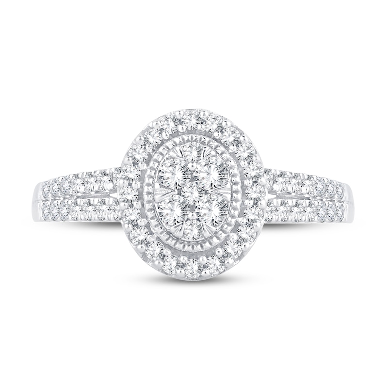 A gorgeous cluster of brilliant round diamonds forms the oval-shaped center in this classic engagement ring for her. Set in timeless 10K white gold, sparkling round diamonds halo the center, and more shimmer down the band in two rows. The ring has a total diamond weight of 1/2 carat. From the Now & Forever® bridal collection.