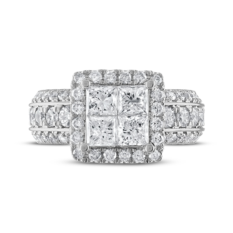 A quartet of stunning princess-cut diamonds make up the center of this gorgeous engagement ring for her. Sparkling round diamonds frame the center and down each side of the band in three rows. The ring is fashioned in classic 14K white gold and boasts a total diamond weight of 3 carats. From the Now & Forever® bridal collection.