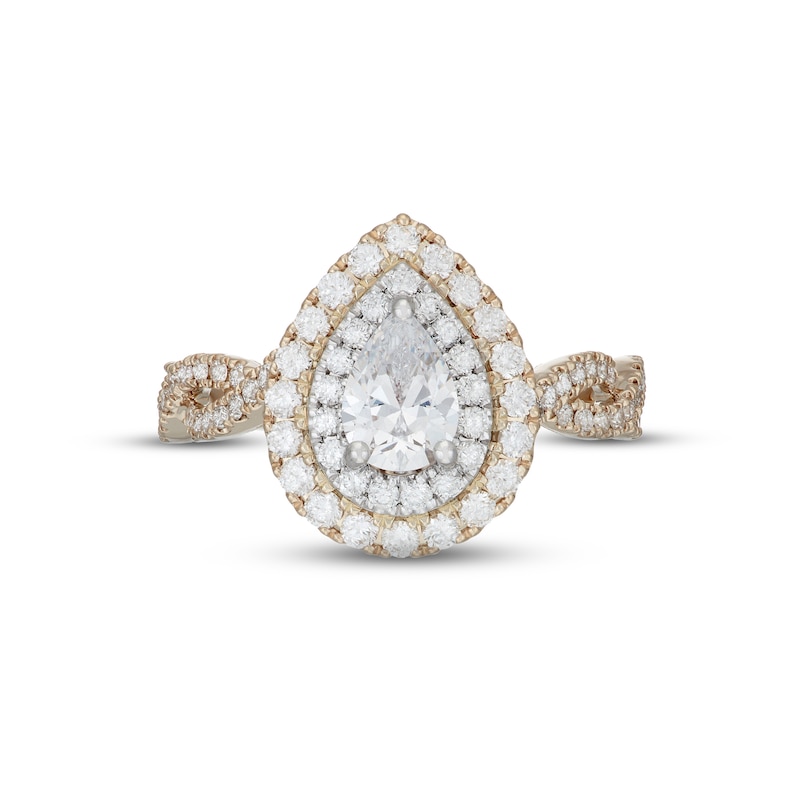 With a dramatic center and brilliant diamonds, this Neil Lane Bridal® engagement ring brings vintage Hollywood glamour into the modern era. A 3/4-carat pear-shaped diamond haloed by round diamonds draws attention to the 14K white gold center. Styled in 14K yellow gold, more round diamonds halo the center and twist along the band. The ring has a total diamond weight of 1 1/2 carats.