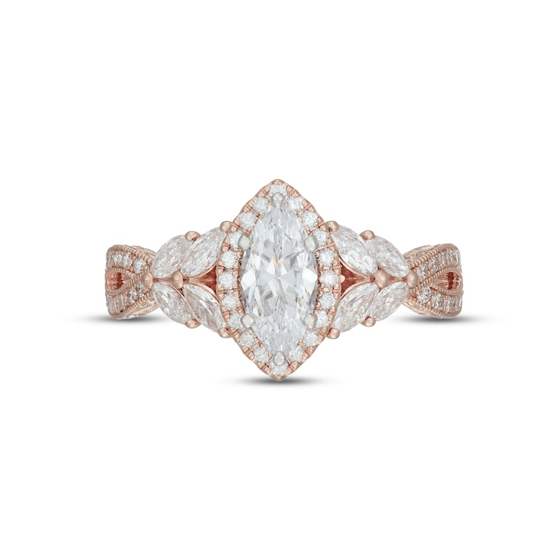 A mesmerizing marquise diamond steals the show in this spellbinding engagement ring from Neil Lane Bridal®. The ring, crafted of 14K rose gold and decorated with brilliant marquise and round diamonds, has a total diamond weight of 1 3/8 carats.