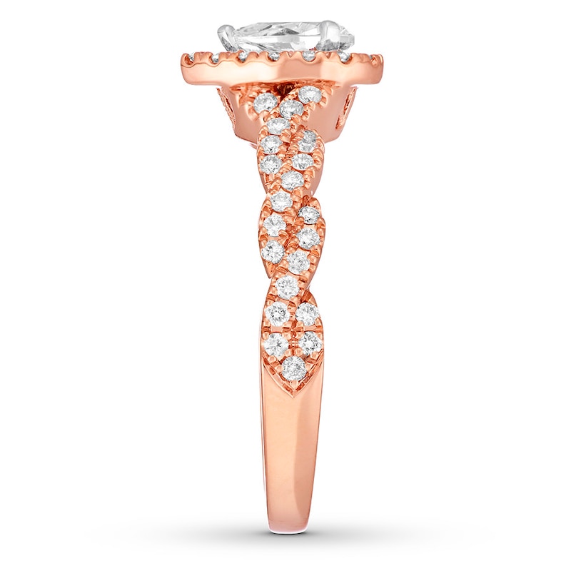 From the Neil Lane Bridal® collection, this glamorous engagement ring showcases a pear-shaped diamond, framed in round diamonds. Ribbons of round diamonds adorn the band for a total diamond weight of 3/4 carat. The ring is crafted of 14K rose gold.