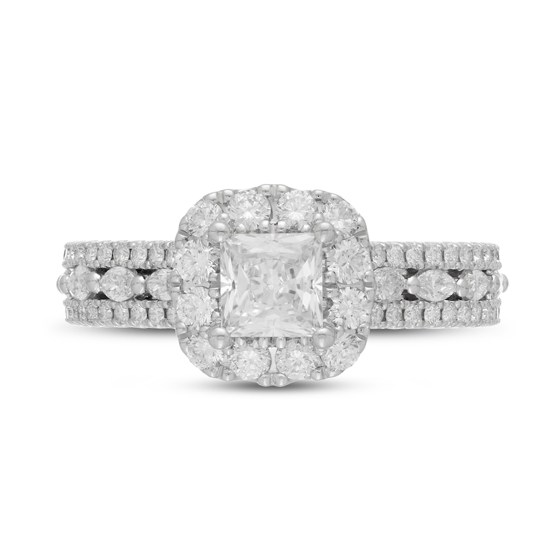 This glamorous women’s engagement ring from the Neil Lane™ Premiere collection features a timeless, stunning design with an impressive array of independently certified diamonds. A breathtaking, 3/4 carat princess-cut diamond shines unforgettably when wrapped in a halo of radiant round-cut diamonds. The band is formed with a brilliant row of marquise-cut diamonds outlined by additional round diamonds. Fashioned in iconic 14K white gold, the ring has a total diamond weight of 1 5/8 carats.