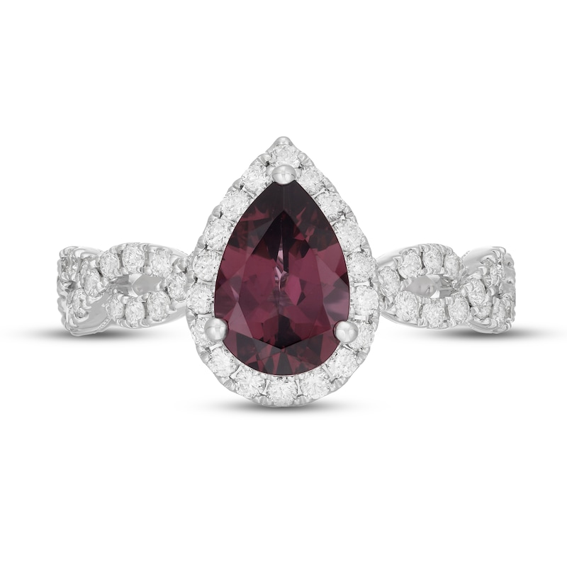 A stunning pear-shaped rhodolite garnet is the center of attention of this engagement ring for her, surrounded by sparkling round diamonds. Twinkling round diamonds adorn the gracefully interweaving band. Crafted in romantic 14K white gold, the ring has a total diamond weight of 3/4 carat. From the Neil Lane Bridal® collection.
